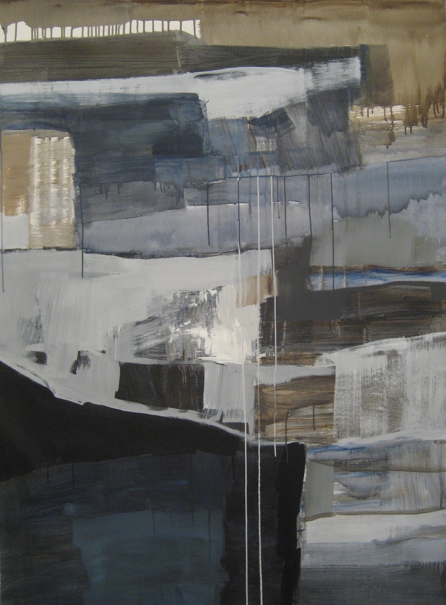 The second subtitled painting, “Breakup 9 (nov 22, 2005)” from 2006 has all of the patchwork of paint swatches that the other works display, but seems more familiar as a landscape or allusion to a waterfront. The layers this time are expansive and the overall feeling is more open and inviting even in the overwhelming grayness. It feels like the sea or a scene from memory Ms. Clarke is trying to piece back together.
